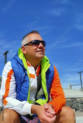 middle-aged man , sitting in the open air, smiling, looking at the sea with a satisfied face, with his hands joined. Live your free time.
