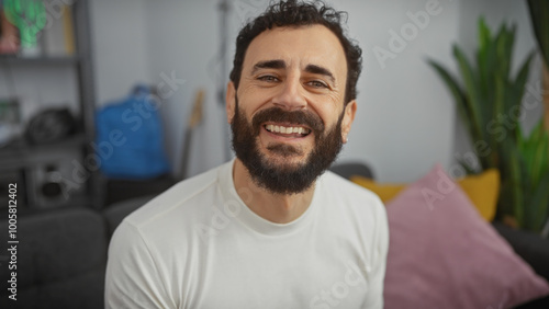 Middle-aged man with beard smiling in a casual modern home interior, exuding warmth and positivity.
