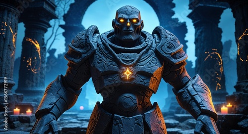 midnight, stone, glowing, etching, twilight, ruin, background, robot, knight, warrior, statue, mediaeval, three-dimensional, helmet, soldier, armoring, armoring, woman, war, astronaut, sword, space, history, ancient, military, metal, children, suit