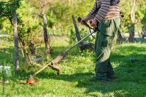 Midsection of unknown Young caucasian man farmer gardener standing in the field with string trimmer petrol Brushcutter ready to cut weed grass working on the farm cutting in the field in sunny day