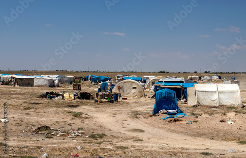 migrant tents, refugee camps. seasonal worker tents in an open area.