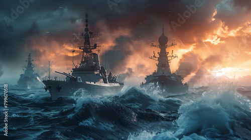 military ships in the sea. dramatic action