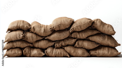 Military-style sandbags stacked in defensive wall formation, realistic shadows and natural brown tones, isolated on pure white background with large copy space