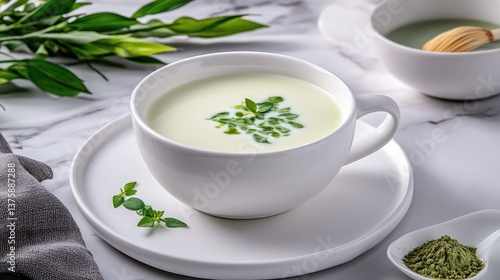 Milk is gracefully poured into a white cup alongside matcha tea powder on a marble surface, showcasing a serene cafe atmosphere.