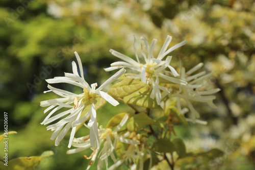 Milky white witch hazel blossom during spring in Kyoto, Japan