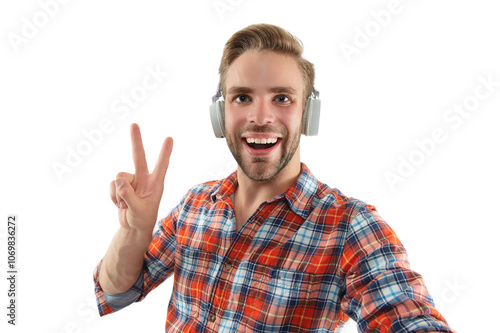 man, music, lifestyle, selfie, earphones, guy, listen, listening, man, generation, student, style, stylish, wireless, playlist, earphones, fun, enjoying, song, audio, musical, sound, dj, isolated on white, isolated, happy, peace