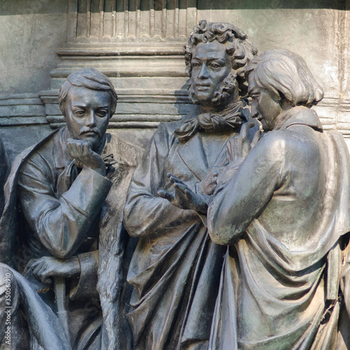 Millennium of Russia monument in Novgorod Kremlin. Mikhail Lermontov, Alexander Pushkin, Nikolay Gogol. Novgorod (Novgorod the Great), Russia.