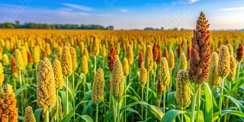 Millet and sorghum plants growing in a lush green field with tall grasses and wildflowers, landscape, nature, landscape