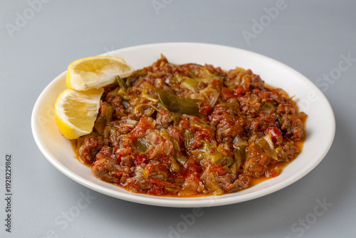 Minced meat and leek dish. Turkish name; kiymali pirasa