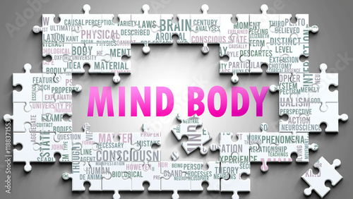 Mind Body as a complex subject, related to important topics. Pictured as a puzzle and a word cloud made of most important ideas and phrases related to mind body. ,3d illustration