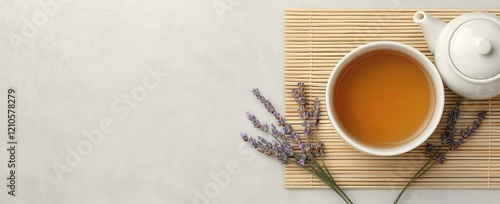 Mindful living with wellness and consciousness concept. A tea cup with lavender on a bamboo mat and stone background.