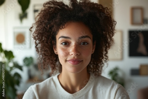 portrait, professional, home, office, remote, work, workspace, authenticity, natural, light, curly, hair, white, sweater, minimalist, interior, lifestyle, career, empowerment, contemporary, personal, branding, modern, confidence, creative, serene, diversity, inclusion, workplace, background, indoor, neutral, tone, soft, calm, focused, genuine, approachable, inspiring, development, authentic, representation, manpower, entrepreneur, technology, digital
