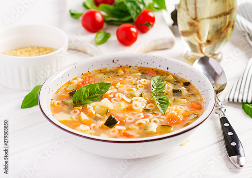 Minestrone, italian vegetable soup with pasta on white table. Vegan soup.