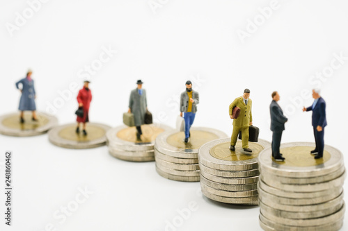 Miniature business man model on increase of stacking coins money with white background. Income and economic inequality concept with copy space and business concept. -Image.