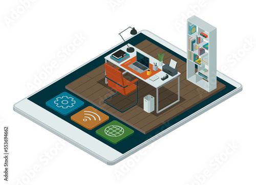 app, smartphone, business, office, desk, desktop, mobile phone, tablet, device, online, telecommuting, telecommuting, laptop, computer, workspace, workplace, interior, room, bookcase, furniture, corporate, equipment, connecting, copy space, mobile phone, communication, small, miniature, touch screen, technology, ar, icon, buttons, web, digital, application, isometric, mobile