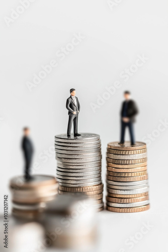 Miniature Businessmen Standing on Stacks of Coins Representing Financial Growth