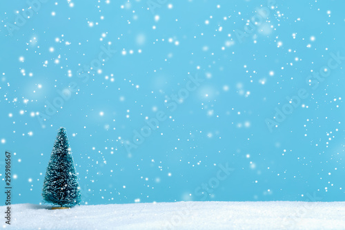 christmas, holiday, tree, christmas tree, tree, evergreen, christmas, winter, green, miniature, small, little, tiny, wood, forest, imitation, toy, decoration, season, seasonal, event, 1, blue, colours, background, snow, snowy, snowing, sky, covered, simple, simplicity, copy space, copy space