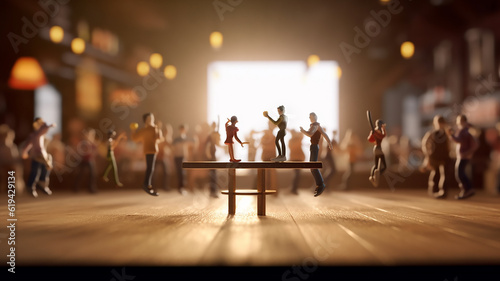 miniature dancing people disco party, blurred background restaurant table. Generative AI