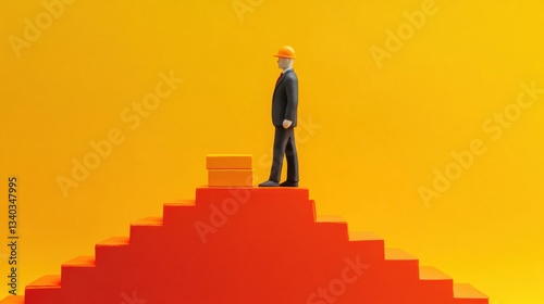miniature, figure, staircase, orange, career, growth, progress, success, ambition, achievement, climbing, step, ascending, yellow, background, business, man, men at work, professional, leadership, goal, opportunity, development, advancement, escalation, elevation, rise, ascension, promotion, construction, helmet, suit, model, tiny, small, scale, concept, illustration, metaphor, symbolism