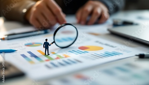 miniature, figure, businessman, chart, graph, datum, analysis, magnifying, glasses, business, finance, marketing, strategy, visual, colourful, detailed, meticulous, focused, precise, report, information, review, planning, management, growth, success, investment, research, sale, market, trend, statistic, illustration, closeup, macro, composition, image, photo, concept, professional, corporate