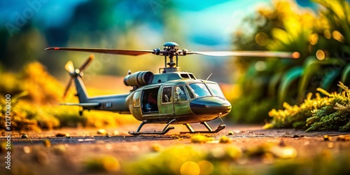 helicopter, miniature, model, toy, rotorcraft, flying machine, aircraft, aviation, flight, airforce, army, military, war, history, nostalgic, cute, charming, detailed, closeup, depth of field, photo, photo, image, picture, royalty free, hi-res, high-quality, background, landscape
