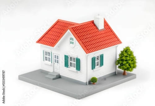 Miniature house model, white exterior, red tile roof, green shutters, small potted plant, tiny Christmas tree, gray base, isometric view, clean background, architectural illustration