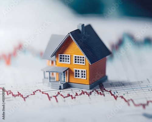 Miniature Model House on Volatile Market Graph Symbolizing Real Estate Investment Opportunities
