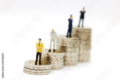 Miniature people: Businessmen standing with coins stack, Finance, investment and growth in business concept.