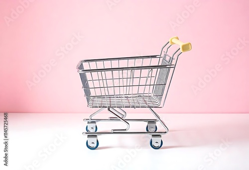 shopping cart, cart, streetcar, miniature, mini, small, toy, pink, light pink, yellow, background, isolated, studio shot, single, 1, object, retail, commerce, consumerism, online shopping, e-business, market, supermarket, grocery, grocery, sale, discount, promotion, purchase, buy, buying, shopping bag, consumer