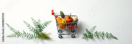 Miniature Shopping Cart with Food & Green Ferns on White Background