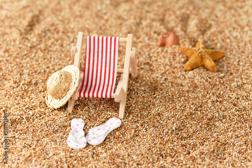 Miniature sunbed on the beach, vacation in the sun.