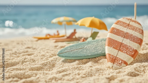 beach, surfboard, summer, vacation, ocean, sand, miniature, travel, relaxation, sunshine, sea, coast, holiday, fun, wave, water, sun, sky, chair, umbrella, pastel, colourful, model, toy, summer, tropical, paradise, get-away, escape, idylli, scenic, beautiful, bright, happy, calm, serene, peaceful, tranquil, relaxing, coastal, photo, image, artwork, illustration