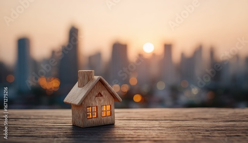 Miniature wooden house on a wooden surface, city skyline in the background at sunset