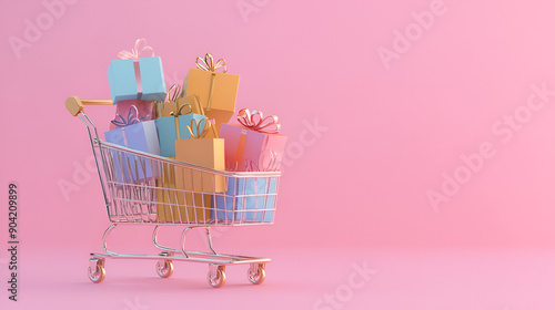 Minimal 3D Illustration of Shopping Trolley with Gifts and Shopping Bags