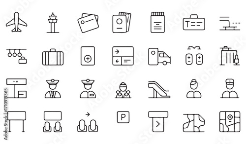 Minimal airport and travel line icons set with airplane, luggage, passport, boarding pass, ticket, customs, departure, arrival, parking, and transportation symbols