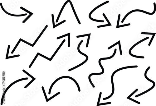Minimal black arrow set vector illustration in hand drawn doodle style featuring simple direction icons ideal for infographic design, business charts, and creative visual guides.
