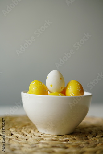 Minimal Easter-themed still life featuring yellow and white polka dot decorative eggs in a clean white ceramic bowl, placed on a woven straw placemat. perfect for illustrating Easter, spring