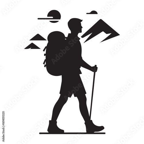 hiking, hiker, trekking, trail, mountain, adventure, camping, backpack, backpack, walking stick, nature, exploration, travel, journey, expedition, sport, activity, recreation, man, male, silhouette, black, isolated, white background, vector, minimal, modern, simple, graphic design, illustration, icon, symbol, landscape, peak, hill, climb, walking, active, lifestyle, wilderness, summer, vacation, tour tourism, fitness, endurance, freedom, challenge