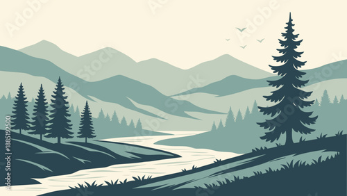 minimal, mountain, landscape, vector, nature, hill, river, forest, pine, sky, gradient, flat, clean, modern, background, template, banner, header, branding, corporate, presentation, design, illustration, scenery, abstract