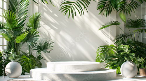 Minimal summer display with a white pedestal, tropical leaves, and pastel pink background
