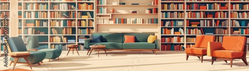 flat, design, illustration, modern, library, bookshelf, reading, area, interior, minimalist, contemporary, education, cognition, study, light, beige, simple, clean, organised, learning, relaxation, literature, academic, calm, peaceful, architecture, art, graphic