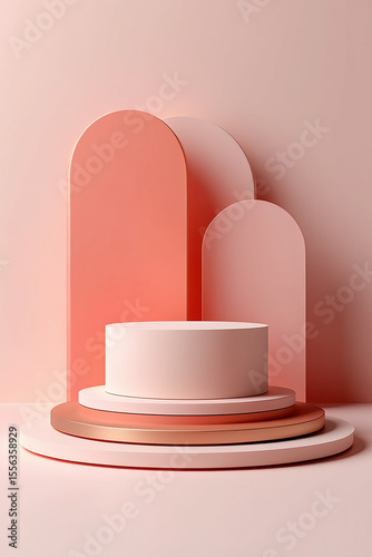 three-dimensional, render, product, display, dais, stage, platform, minimalist, modern, clean, simple, geometric, arch, rounded, background, studio, lighting, soft, gentle, pastel, pink, peach, coral, rose, gold, metallic, shiny, smooth, gradient, layer, stacked, showcase, presentation, advertising, marketing, promotion, beauty, cosmetic, fashion, luxury