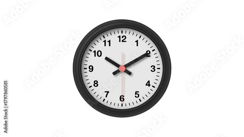 Minimalist analog wall clock with black frame, white face, bold black numbers, and red second hand, set against a solid transparent background. background removed