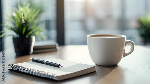 Minimalist and modern office workspace setup with a cup of coffee a notebook and a pen on a blurred background creating a clean and professional environment for work and productivity