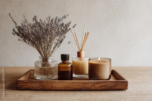 Minimalist arrangement of soy candles, essential oil diffusers, and dried lavender on wooden tray, creating calming home fragrance and ambiance, perfect for wellness articles with warm ambient lightin