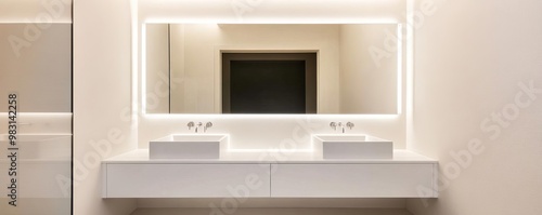 minimalist, tile, bathroom, neutral, recess, light, large, mirror, sleek, modern, design, comfort, atmosphere, beauty, fixture, contrast, concept, storage, decor, ambience, fitting, colours, ambience, surface, texture, hygiene