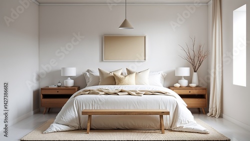 Minimalist Bedroom Interior: A serene and stylish bedroom features a minimalist design with a large bed, wooden nightstands, a neutral color palette, and soft natural light streaming in from a window.