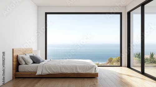 Minimalist bedroom interior with ocean view through large windows, emphasizing tranquility and modern design.