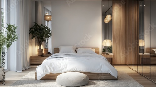bedchamber, minimalist, modern, contemporary, interior design, home decor, wooden floor, plant, natural light, window, lamp, bedside table, rug, ottoman, cosy, comfortable, relaxing, peaceful, serene, clean, simple, roomy, airy, bright, luxury, elegant, stylish, apartment, house, home, living, lifestyle, interior, decoration, design, home improvement, real estate, architecture, furniture, bedding