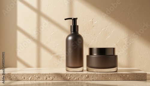 Minimalist black skincare set on stone surface - AI generated beauty product photography